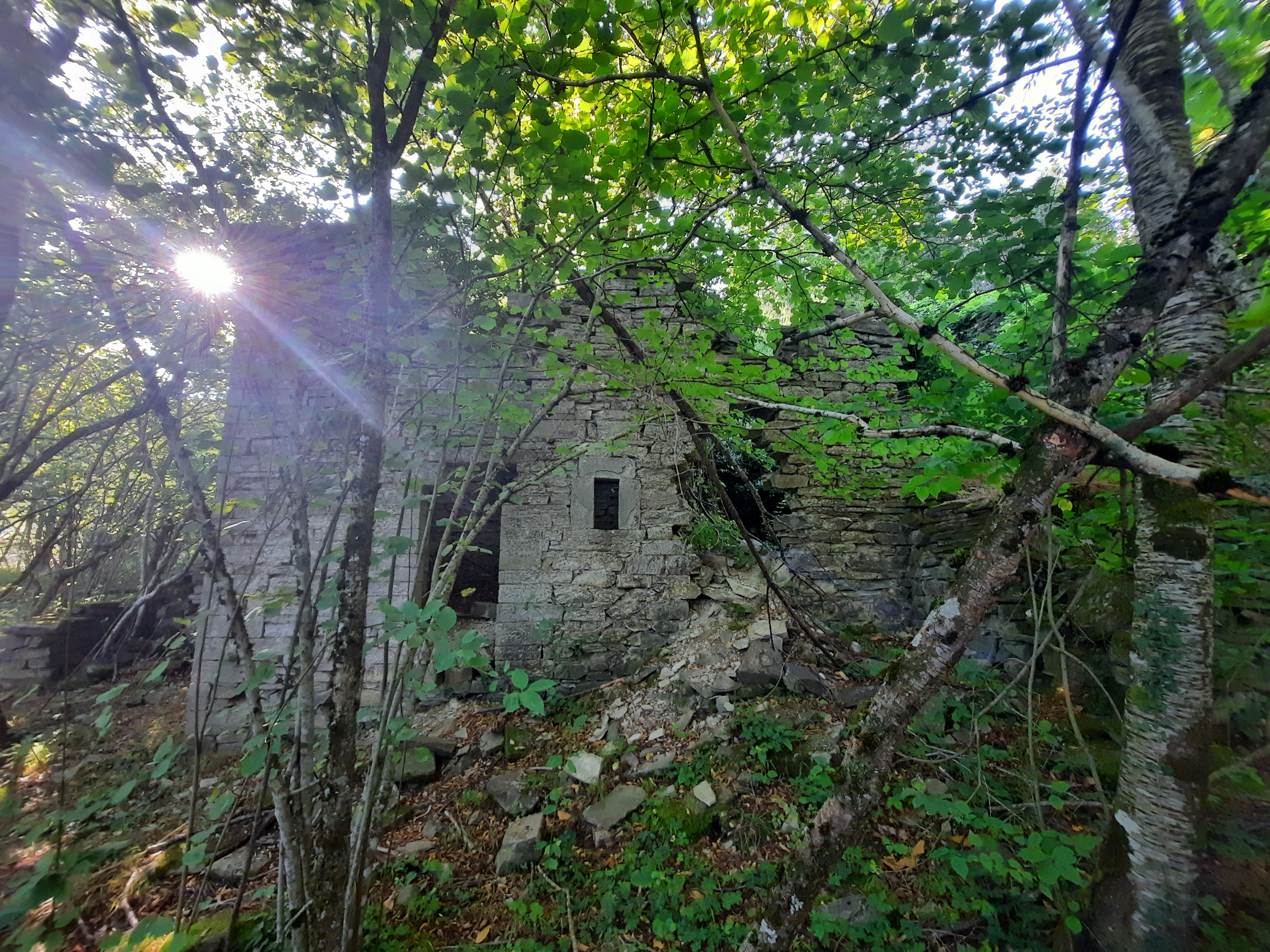 Ich komme an einem Haus im Wald vorbei, wo ein älterer Mann versucht eine klemmende Tür zu mobilisieren. Ich grüße ihn und ein Wort gibt das nächste und eine Geste die andere...und schon sitze ich in der Hollywoodschaukel, bekomme Kissen und mache eine Pause. Wir " fachsimpeln" über die Tür und nach 3x -ligen Aushängen mit meiner Hilfe, Sprengringen und Stemmeisen funktioniert sie wieder. Als Dankeschön teilt er seinen Kuchen mit mir und bietet mir Bier bzw. Wein an. Den Kuchen esse ich gerne, den Alkohol lasse ich, denn ich muss noch abwärts laufen. Er gibt mir zu verstehen, dass alle Deutschen Bier trinken. Ich bestätige es imm, berufe mich aber auf den Abend.